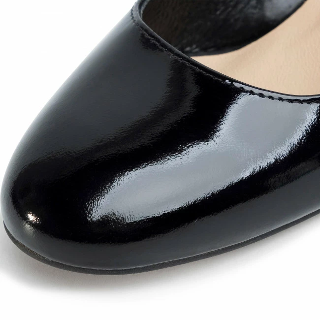The upper is made of patent leather, which is a natural material, that makes the shoes comfortable, pleasant for the feet and on top of that – stylish and modern because of the glossy finish.